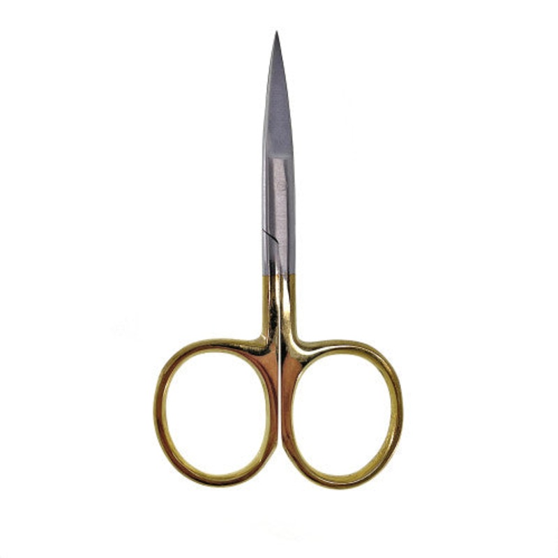 Straight scissor of bright stainless steel with gold-plated handles and extra large loops.