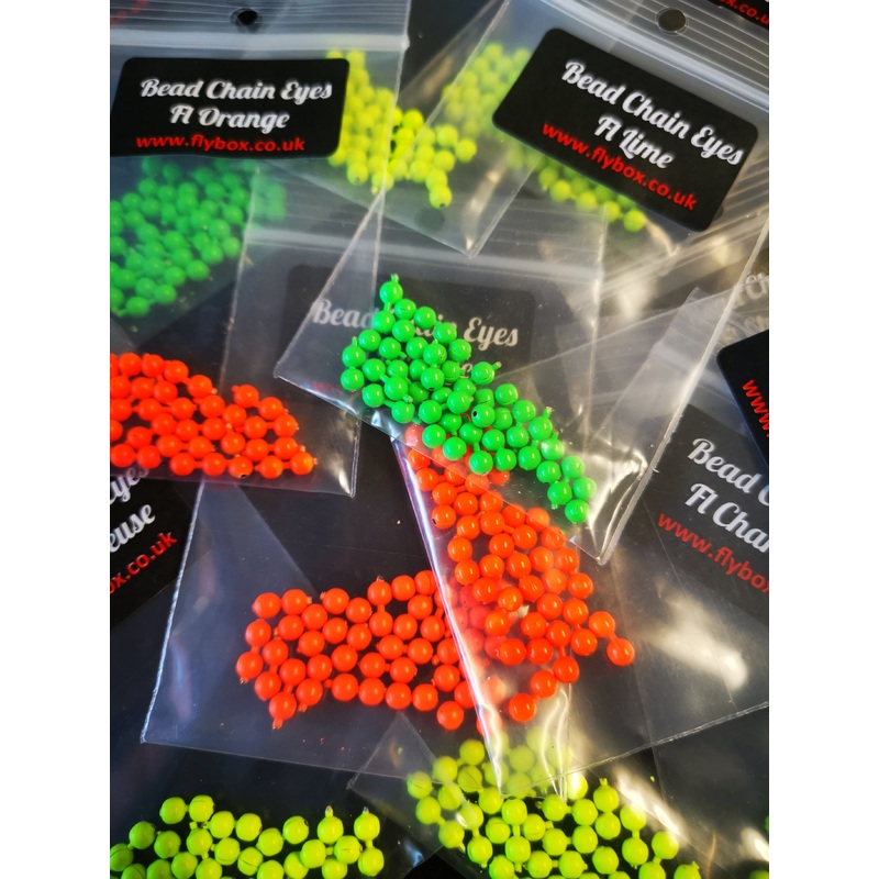 Fluorescent painted bead chain eyes. Brilliant for tying hot eyes onto your favourite lure patterns. Each pack contains 24 x pairs of eyes, already pre-cut, therefore no need to get the pliers out and risk damaging them! Our Standard Bead Chain Eyes are 3mm size.