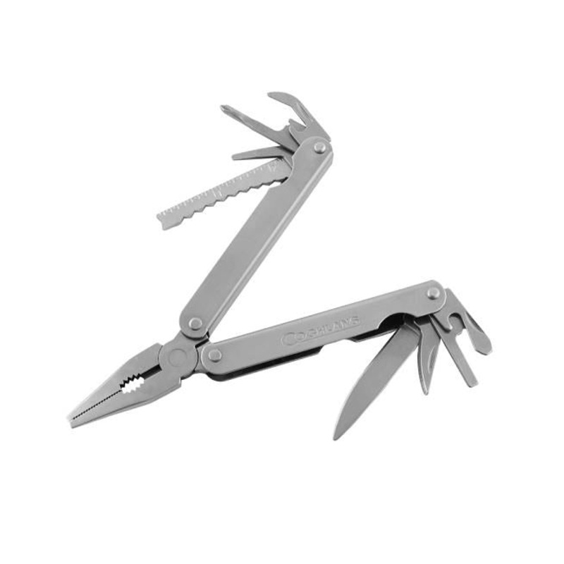 Camper's Tool PRODUCT FEATURES Includes combination regular and needle nose pliers, vise grip teeth, wire cutter, 3 sizes screwdriver blades, Philips screwdriver, can opener, punch/awl, bottle opener, file and two knife blades with carrying case. Stainless