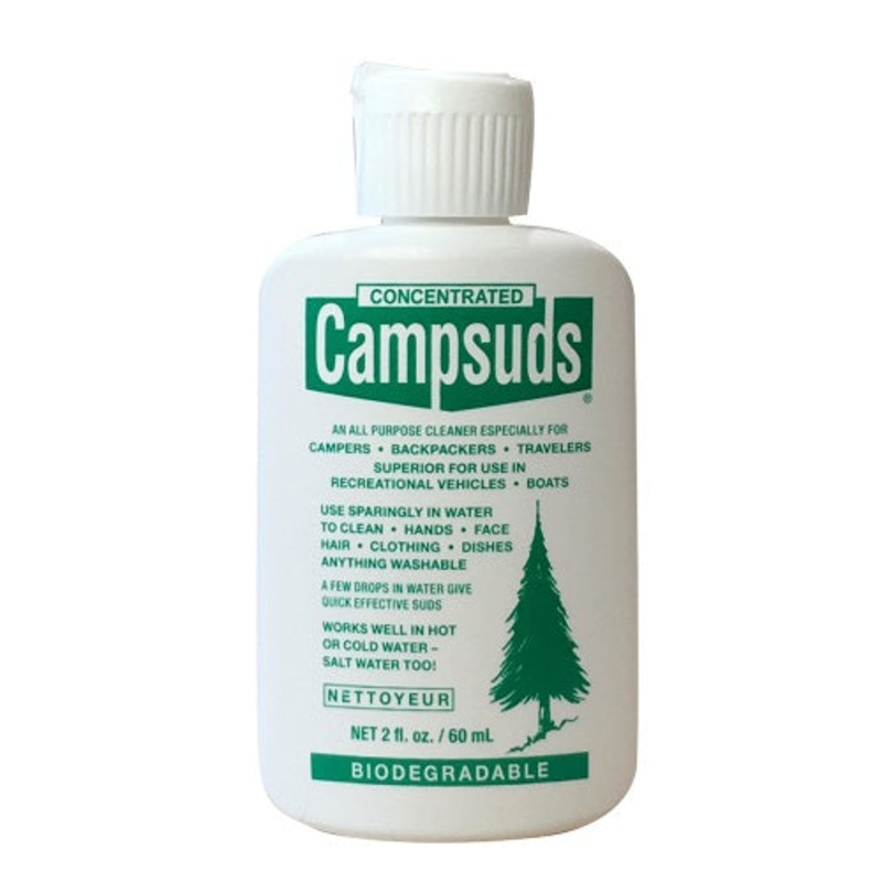 Campsuds is well known and trusted as the finest outdoor cleaning product available. The super concentrated formula requires only a few drops for most outdoor cleaning jobs, but the pH-balanced formula is gentle enough to be used as a bath soap or shampoo. The 100% biodegradable Campsuds is effective in hot, cold, soft or hard water. Available in 2oz. (60 ml), 4oz. (120 ml), 8oz. (240 ml), 16oz. (500 ml) standard bottles or 1 gallon size.