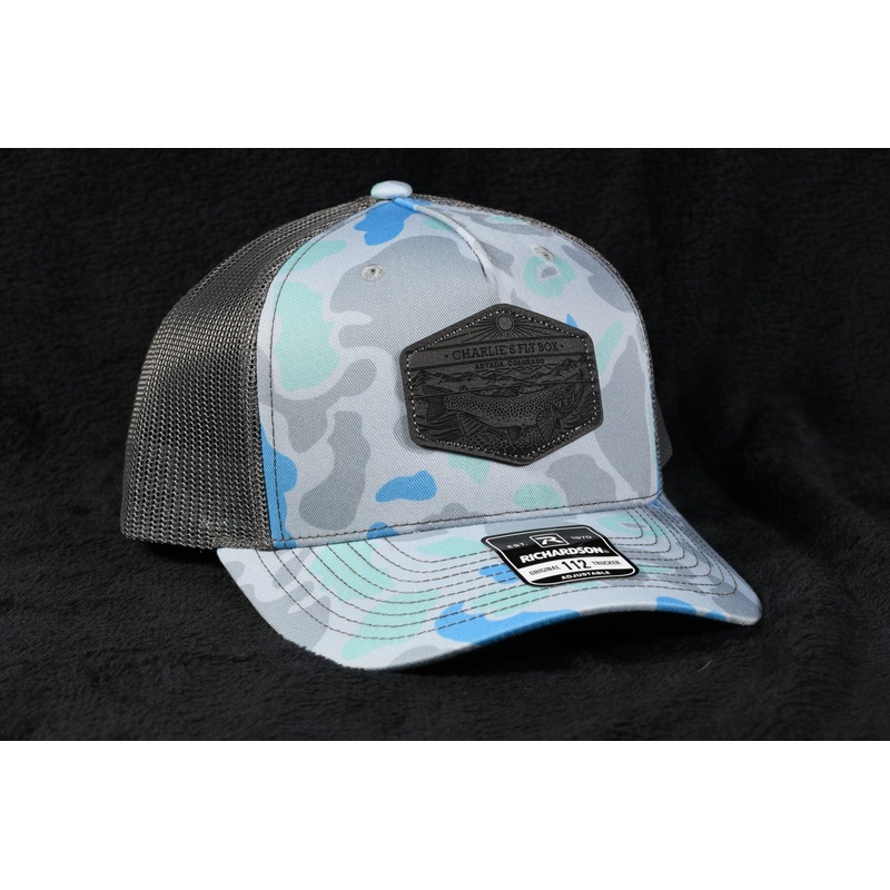 0056CFB Leather Patch Trucker Hat, Blue Camo/Gray