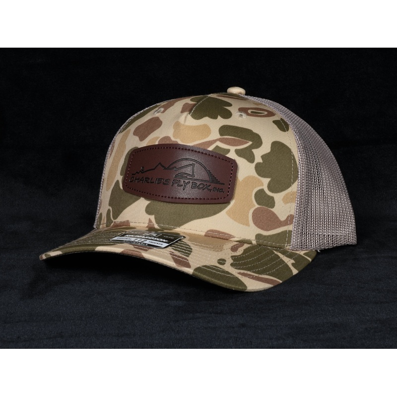 04360CFB Trucker Hat, Tan Camo with Leather Patch Logo