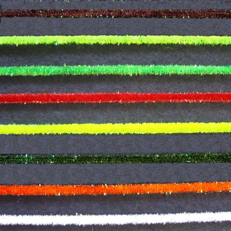 4 mm diameter. 2 metres long. Twice the density of fibres. Bonded for extra strength and with a twinkle of pearl tinsel. A massive improvement over conventional chenille.