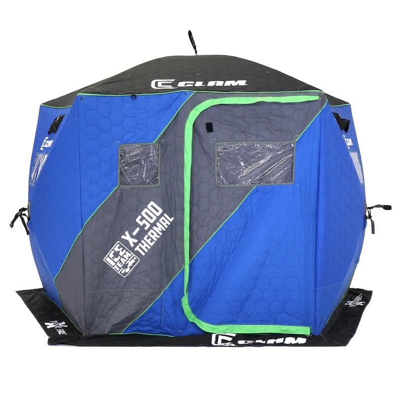 The X-500 Thermal Hub boasts 62 square feet of fishable area but packs down small for easy transport. This 5-sided portable hub house has plenty of room for gear and other anglers! Ice anglers will also enjoy the unique X-series features and the Max Entry door that allows for easy entry into the ice shelter. Unlike other doors on the market the Max Entry door allows you to bank in your shelter and still have full use of your door. As part of the X-Series of Clam hub shelters, the X-500 Thermal has industry leading hubs, poles, and thermal fabric that make this an excellent shelter for any ice angler. The Ice Team model features Clams Aurora Lighting System for built in lights inside your shelter! Fish longer and more comfortably with the convenience and durability of an X-500 Thermal Hub Shelter by Clam Outdoors!