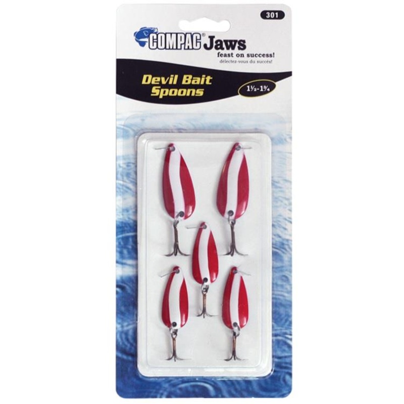 Compac Devil Bait Spoons PRODUCT FEATURES: *Red and White Spoons*Famous style spoons in assorted sizes*For casting, spinning and spincasting.*5 spoons per card