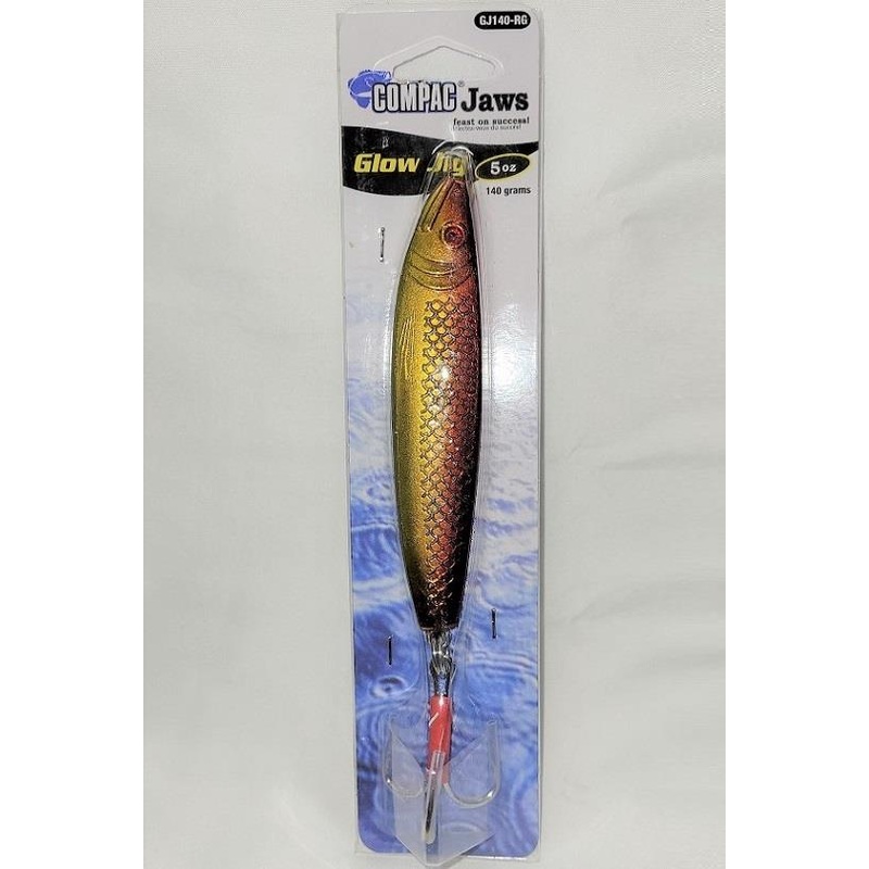 Compac Glow Jigger 5oz Red/Gold PRODUCT FEATURES: *Lead jigs coated with clear, hardened lacquers for a lustrous shine.*Rigged with nickle treble hook.