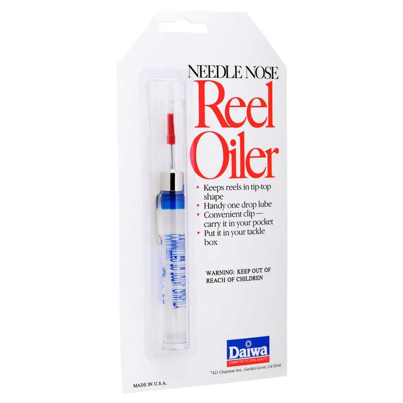 Daiwa Reel Oiler Needle nose oiler for ball bearings and fine moving parts Keeps reels in tip-top shape Handy one drop lube Convenient clip - carry it in your pocket Put it in your tackle box Made in U.S.A.