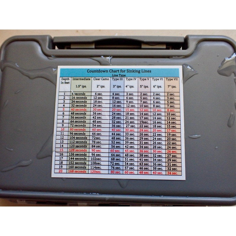 Akey thing to note when you start off with your first sinking fly line/s, you need to be systematic about how deep youre fishing every cast and keep varying your retrieves to present the flies at different speeds and cadences. The fly line to depth speed is measured in seconds of countdown. Sinking fly lines come in sink rates of 1/per sec. to 9/per second. For example, a countdown in increments of 5 seconds on every cast in order to cover depths effectively is made to ensure fishing the water column in time/depth intervals. This chart allows a quick visual while on the water to determine depth by time allowable fly line sinking. The depth chart can be conveniently stuck to a fly box, boat bag, thwart board, or boat gunwale in a suitable fashion to be quickly at hand.