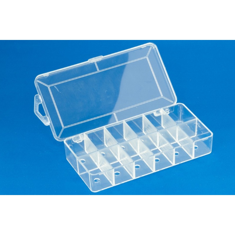 Empty dubbing dispenser box A 12 compartment empty dubbing dispenser. Each compartment has a hole for extracting the dubbing and lid opens for refilling.
