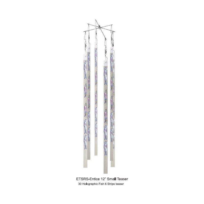 Entice Small Teaser 6 Strips 120cm 12 Fixed 6 armed Dredge bar, rigged with 6 holographic strips that each contain 5 fish for a total of 30 fish teaser. There is provision for an additional strip to be added at the centre of the teaser if required. Fish on