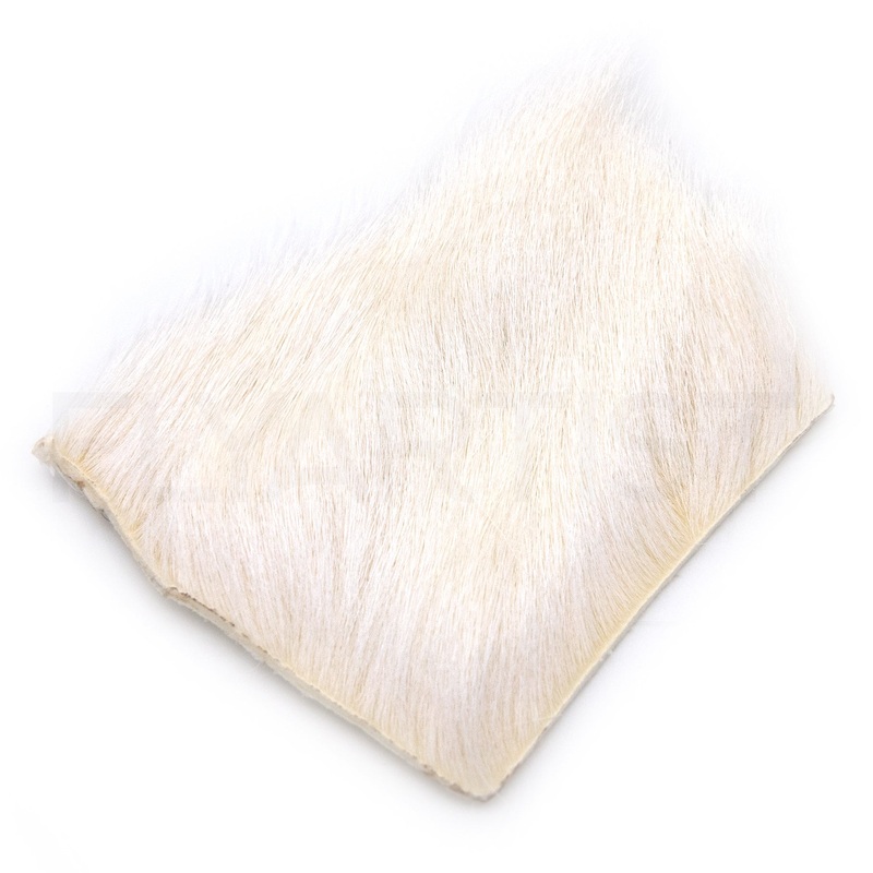 White calf body hair is an excellent fly tying material for tying dry fly wings, parachute posts, and tailing due to it's fine and straight fibers that won'tflare out when tightened. Hide patch measures approximately 2 square inches.