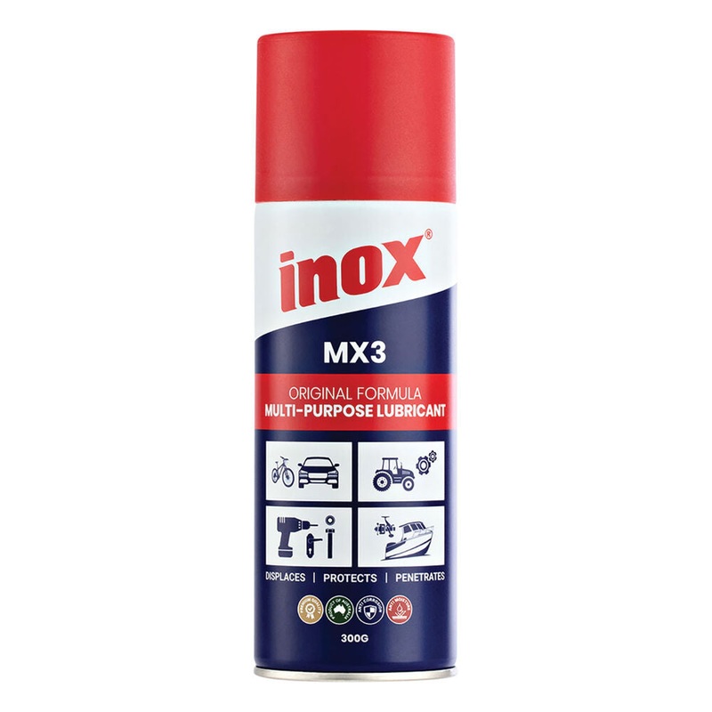 Inox MX3 Spray Displaces, penetrates, lubricates and protects. INOX-mx3 contains no silicon, acid, kerosene or dieselene. INOX-mx3 will not harm metal points or surfaces, hard plastics, paints, enamels, fibreglass, formica or neoprene seals INOX-mx3 doesnt