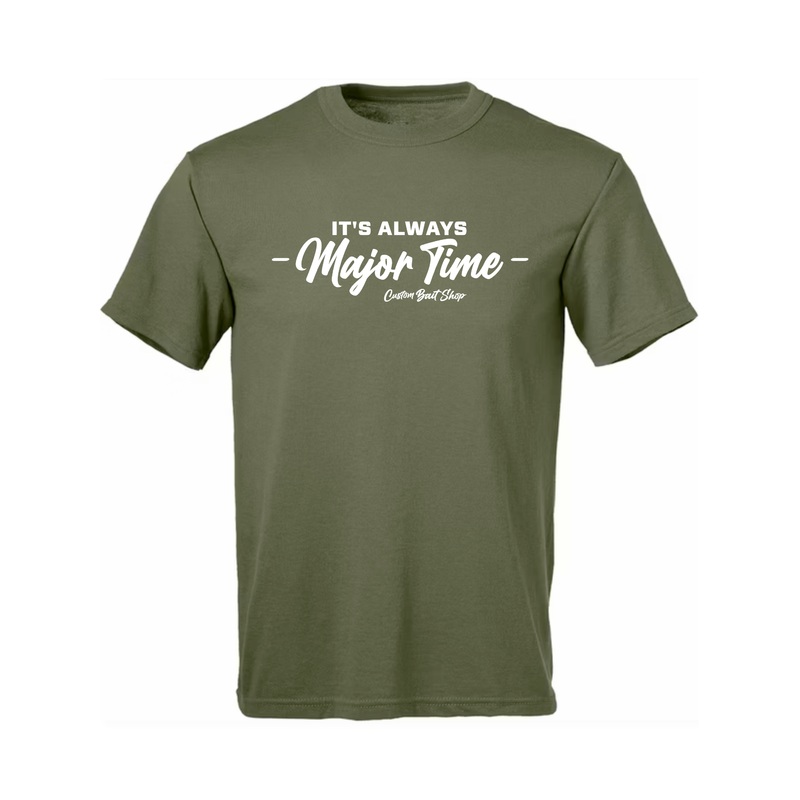Sporting Custom Bait Shop apparel not only adds a touch of style but ensures you look effortlessly cool out on the lake, representing your passion for angling with every cast. Embrace the angler's spirit with the "It's Always Major Time" T-shirt from Custo