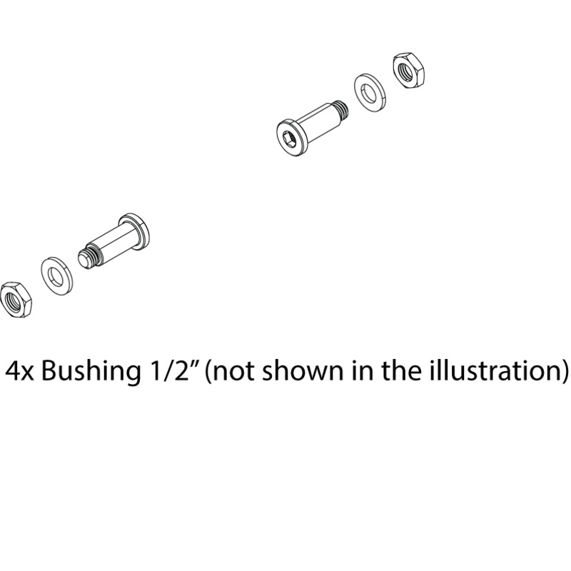 2x Bolt, rear hinge4x Bushing, 1/2″ (not show in the illustration)2x Washer, M10, 316SS2x Jam nut, M10