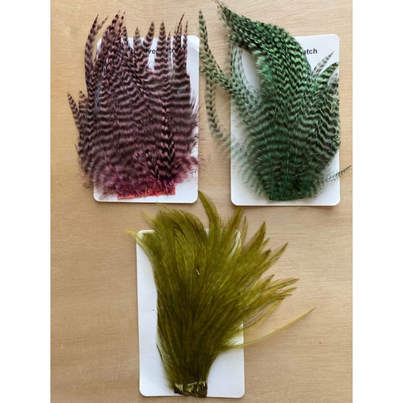 For use on saltwater and pike/bass flies up to size 1/0. Colors: sooty olive, olive, grizzly red, grizzly brown, grizzly olive, grizzly green, grizzly pink, grizzly yellow. Item# 1435