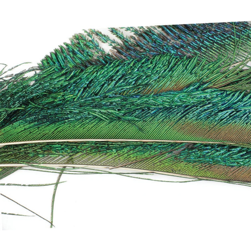This part of the peacock fowl is used for tailing and wings on patterns such as the Alexandra. The barbs are typically between 1/2" and 3" long. Colors natural and bright green. Item# 3775