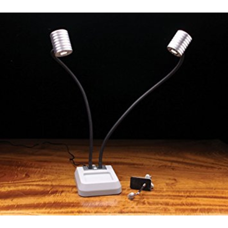 Two 220 Lumen lights with daylight illumination. Flexible 18″ arms direct light to any postion needed. Comes with heavy, non-tipping table base with built in tray and magnet. Includes bench C-Clamp for surfaces up to 2 3/4″ thick. Removable from table base and will mount to 3/8″ post. Item# 2150