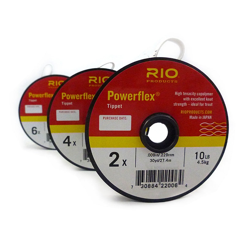 RIO Powerflex Tippet|8X .003″ 1.5 lbs 30 yds|7X .004″ 2.4 lbs 30 yds|6X .005″ 3.4 lbs 30 yds|5X .006″ 4.9 lbs 30 yds|4X .007″ 6.4 lbs 30 yds|3X .008″ 8.2 lbs 30yds|2X .009″ 10 lbs 30 yds|1X .010″ 13 lbs yds|0X .011″ 15 lbs 30 yds|.013″ 20 lbs. 30 yds