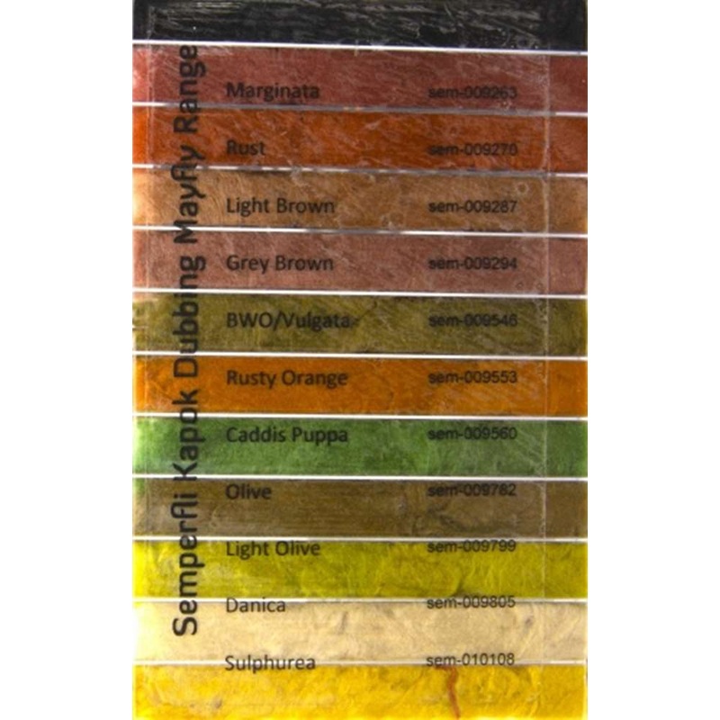 Traditionally Kapok is very difficult to dye however the team at Semperfli have been working with computer based dying machinery which has enabled it to bulk dye Kapok Dry Fly Dubbing Mayfly Dispenser with repeatable colours every time. With Kapok Dry Fly Dubbing Mayfly Dispenser buoyancy is lost slowly, tests have left it for days in test baths and it very slowly over days absorbs water.