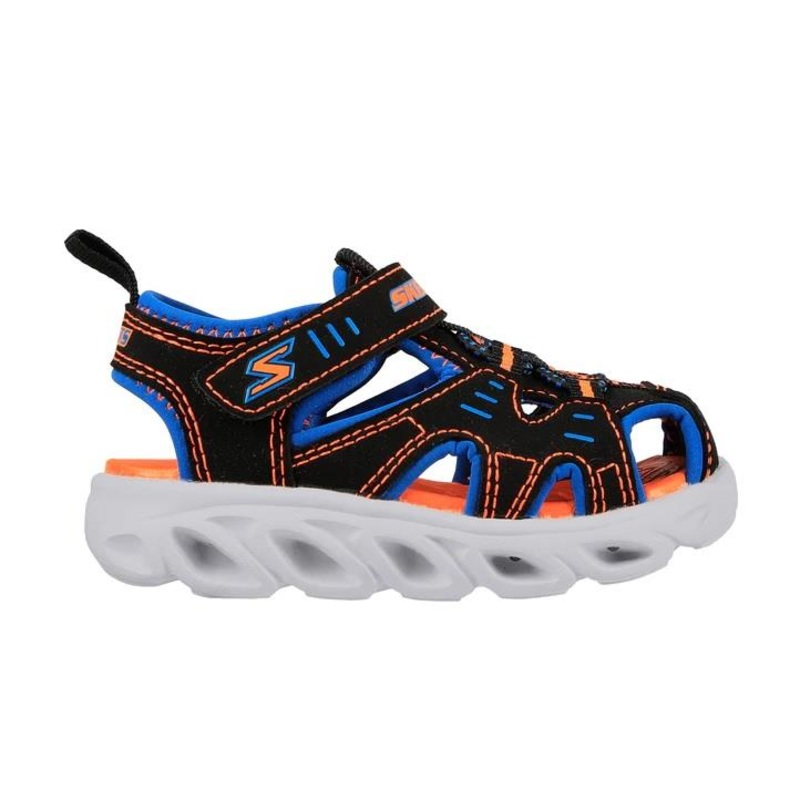 Skechers Splash-n-Play Sandals - Boys This sporty peachy-style toddler slip-on sandal has a synthetic and fabric upper with a contoured cushioned footbed, plus fun lights in the sculpted midsole. PRODUCT FEATURES *Durable fabric and synthetic upper*Sporty