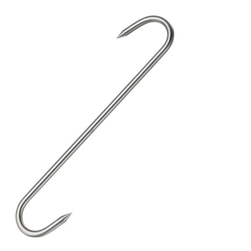 Slakte-/kjttkrok 22cm. Stl Kjttkrok produsert i rustfritt 14/1 stl, 0,6mm.Brukes til henge kjtt, vilt eller fisk til mrning eller i rykeovn. Spesifikasjoner: Tler 8-10kg Materiale,rustfritt 14/1 stl Den S-formede kroken kan brukes flere plasser, for eksemp